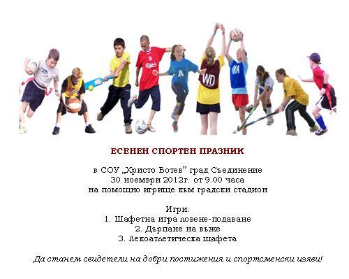 На 30 ноември 2012г. учениците на СОУ „Христо Ботев“ град Съединение участваха в Есенен спортен празник. С много настроение и спротен дух те се забавляваха и играха, спечелиха грамоти и награди за постиженията си.